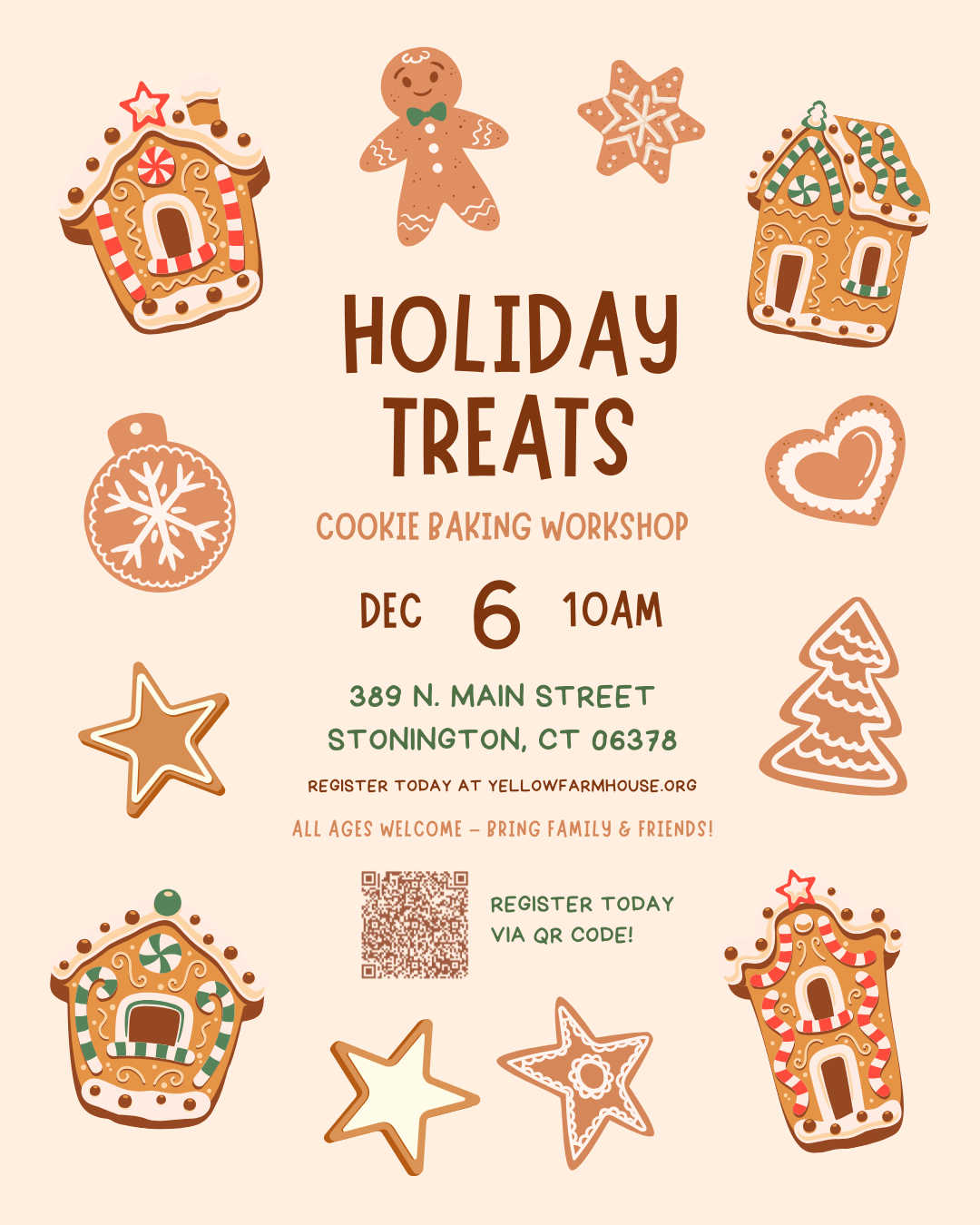 Gather your friends and family for a festive cookie-baking adventure with Yellow Farmhouse educators! Mix, roll, cut, and decorate delectable treats in our historic farmhouse kitchen. Bring your creativity and leave with a dozen fresh-baked cookies and holiday memories to cherish. All ages welcome! Saturday, December 6 from 10AM - 12PM | Event Page ($40/person) $40 | Registration Page